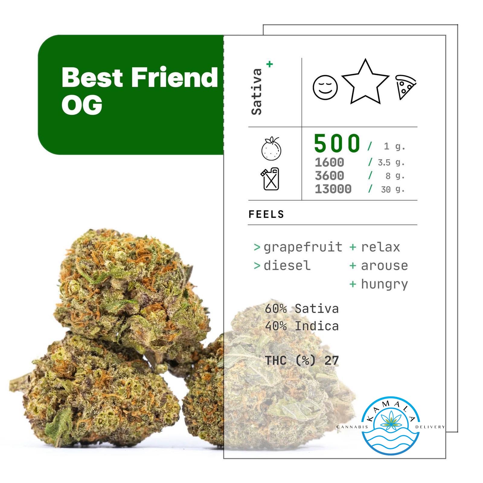 The Best Friend OG strain is a 60/40 sativa-indica hybrid with an average THC content of about 20%. This bud’s high kicks off with a strong, euphoric, and energetic lift that’s great for going out and getting social or staying in and getting giggly with close friends.